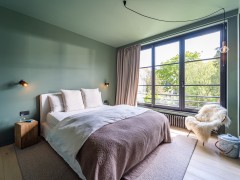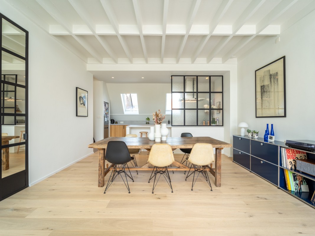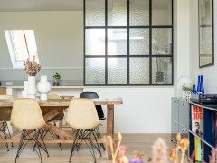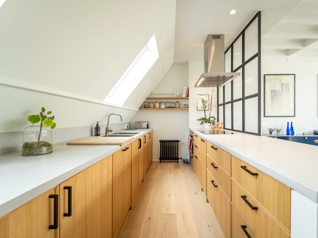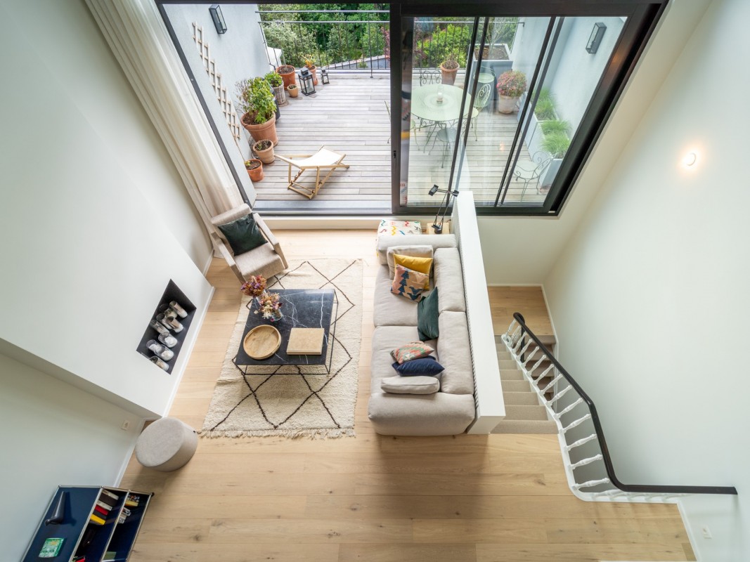 In this triplex, we have organised bedrooms on the lower floor in order to keep the beautiful views of the top floor for the living space. The impression of volume is given by a large bay window while the mezzanine makes the kitchen and the dining room more intimate.