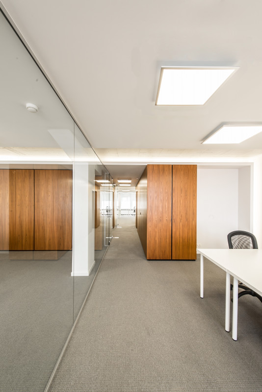 The structure of the building is revealed by glass walls whereas technical spaces have been covered with wood veneer which, all in all, brings an interesting balance in materials.